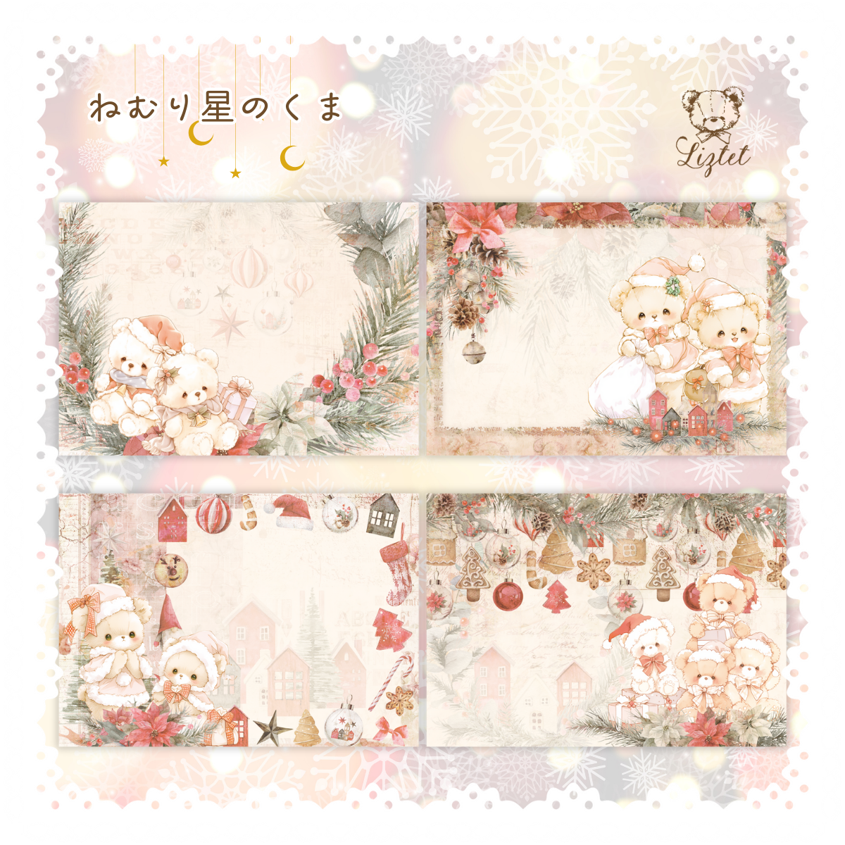 ポインセチアやオーナメントをあしらったクラシカルなデザインが、やさしい冬の雰囲気を演出します。