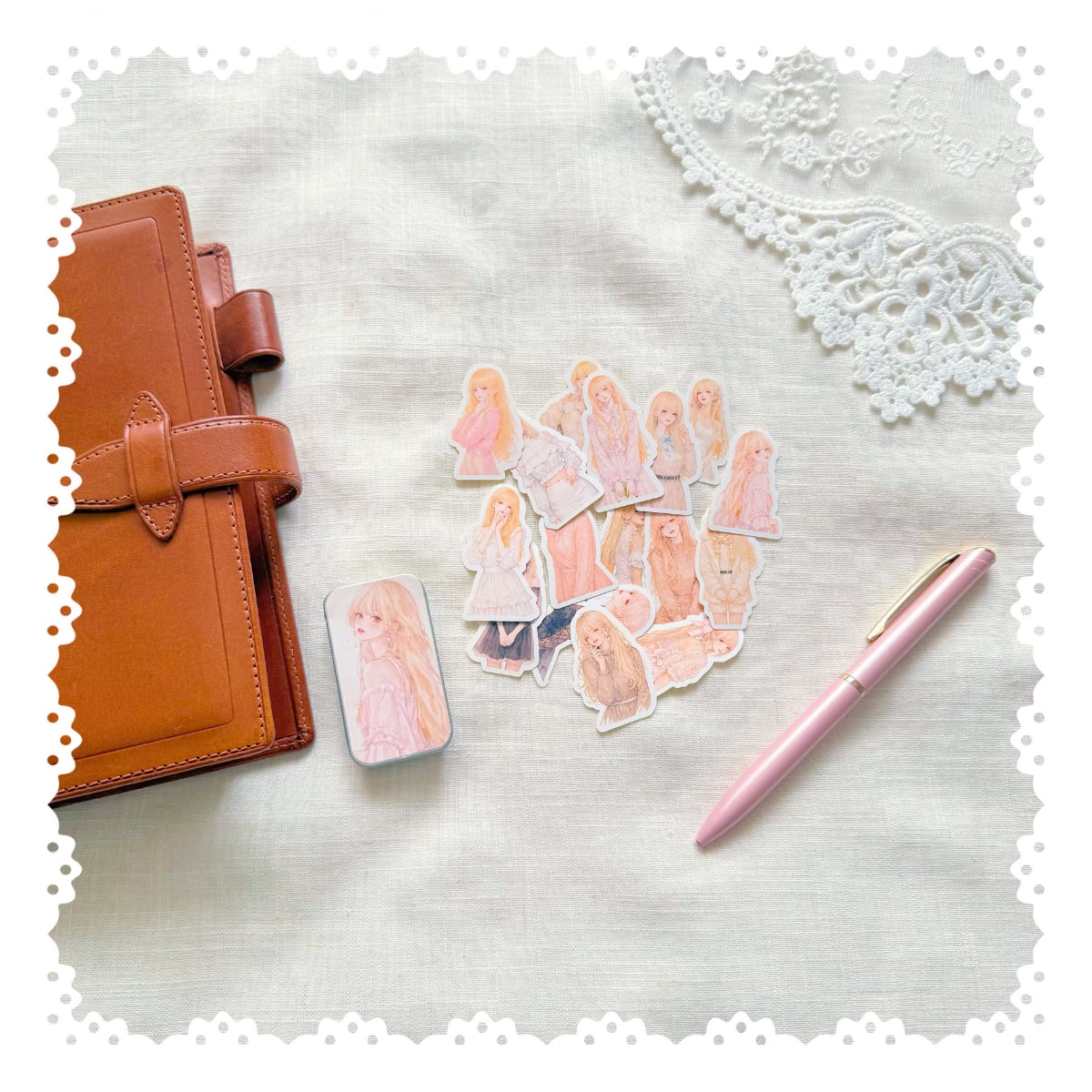 くまダイカット・女の子ダイカット・くま缶入りシール・女の子缶入りシール・くまA5コラージュペーパー(ランダム28枚)・女の子A6シートシール(ランダム5枚)のどれか、お好きなノベルティをお選びいただけます。